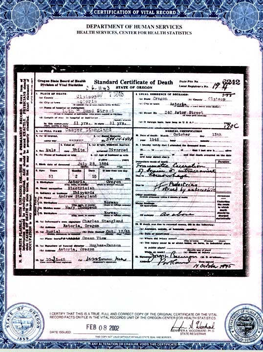 | Caspar Christiansen Stangland was born in Astoria, Oregon on July 28, 1884 to Andreas (Andrew) Stangland and Maren Thorstensdtr (Mary Thompson). He was one of 15 children: Carl, Walter, Andrew, Mamie, John, Alfred, Magnus, Marshall, Inga, Emil, Lawrence, Myrtle, and two who were stillborn or died in infancy. |